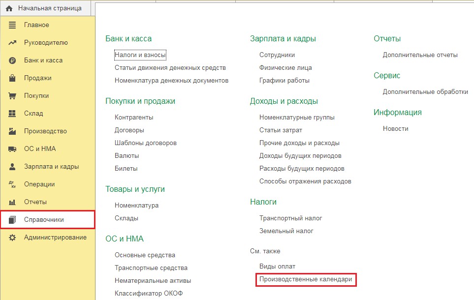 В программном продукте 1С: Бухгалтерия 8, редакция 3.0 следует перейти во вкладку «Справочники» и выбрать раздел «Производственные календари».