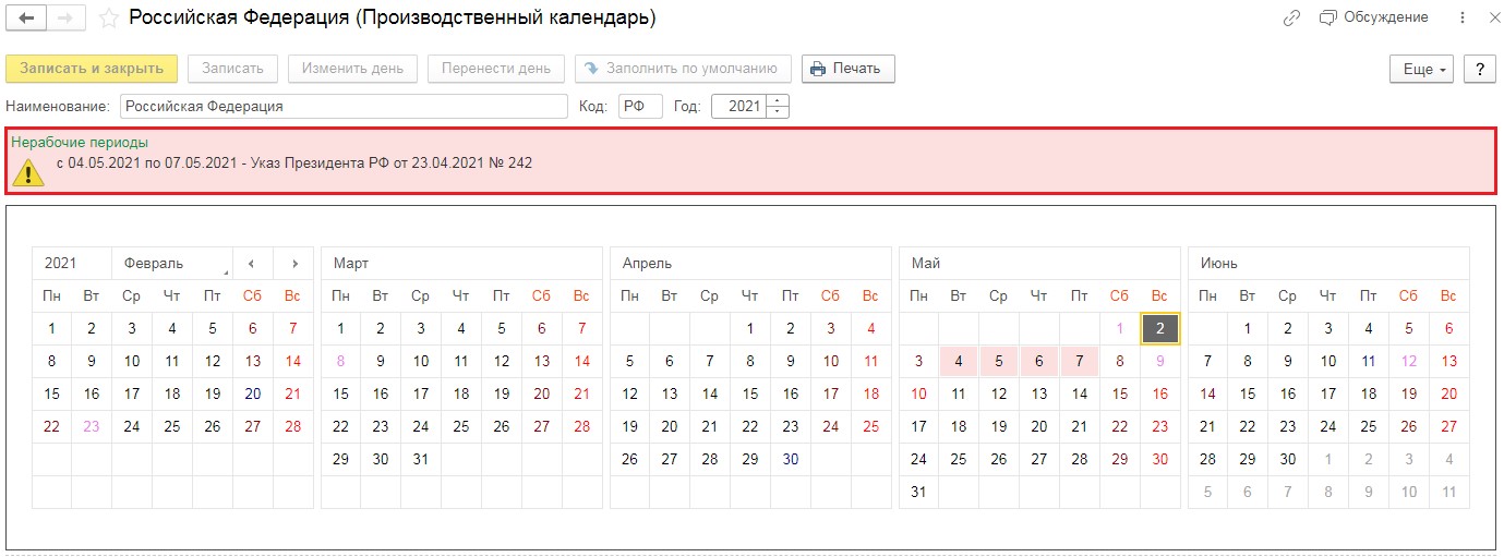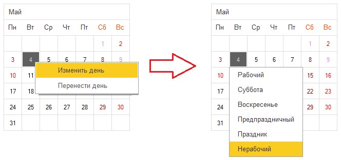 4. Если невозможно выполнить и третий шаг из-за недоступности к порталу 1С, то производственный календарь необходимо настроить самостоятельно вручную. После клика правой кнопки мыши по определенному дню, вам будет предложено два варианта: редактировать день или перенести его. Для периода с 04.05 по 07.04 необходимо щёлкнуть на пункт «Изменить день» и указать эти дни как нерабочие.