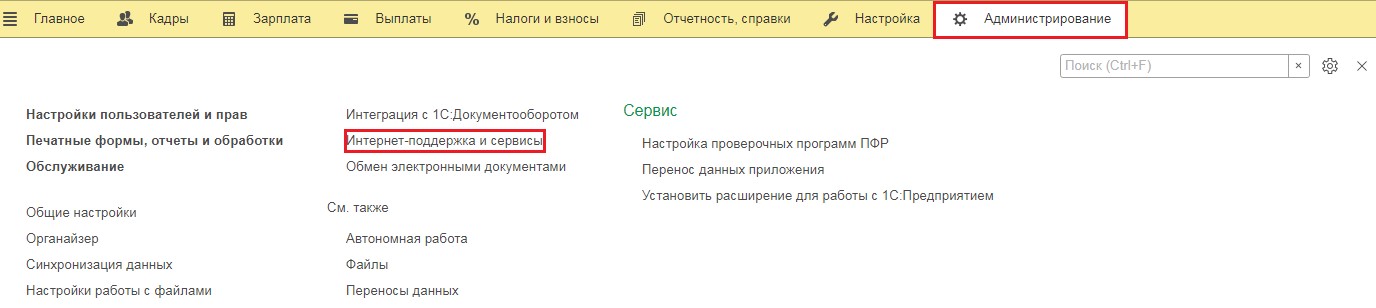1. Проверить включена ли интернет-поддержка во вкладке «Администрирование» раздел «Интернет-поддержка и сервисы». При этом сама программа должна иметь оф. поддержку.