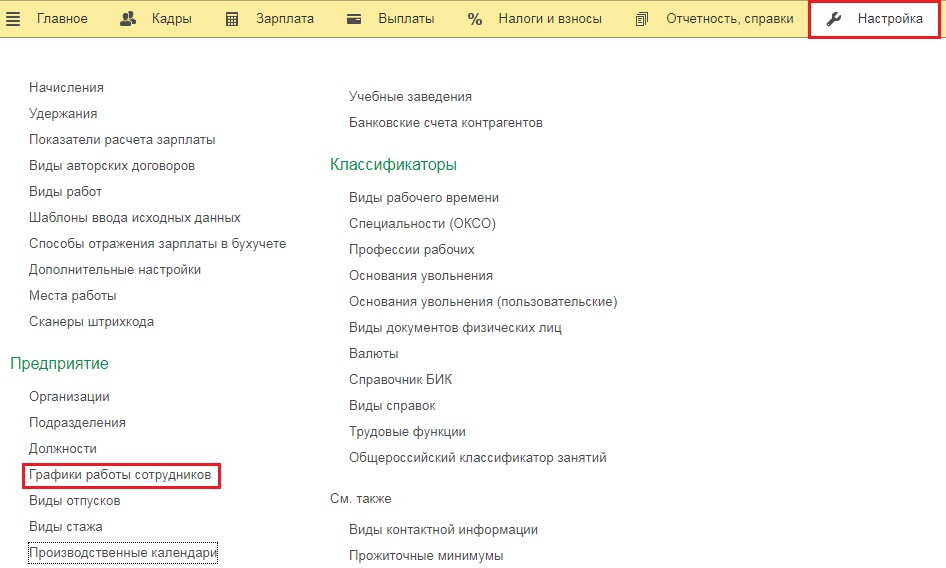 В программном продукте 1С: Зарплата и управление персоналом необходимо перейти во вкладку «Настройки» и перейти в пункт «Графики работы сотрудников».