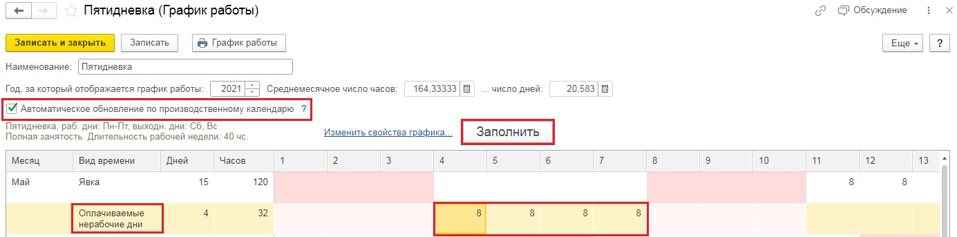 Выбираете график и проверяете проставлена ли галочка на пункте «Автоматическое обновление по производственному календарю». Если она отсутствует, то щёлкните мышью на окошко «Заполнить». После этого проверьте помечен ли период с 04.05 по 07.05 нерабочими и оплачиваемыми днями.