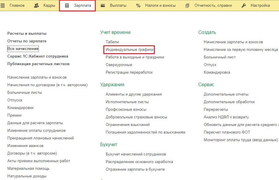 После этого для управляющего предприятием, следует создать "Персональный график" во вкладке «Зарплата» в программном продукте 1С: Зарплата и управление персоналом.