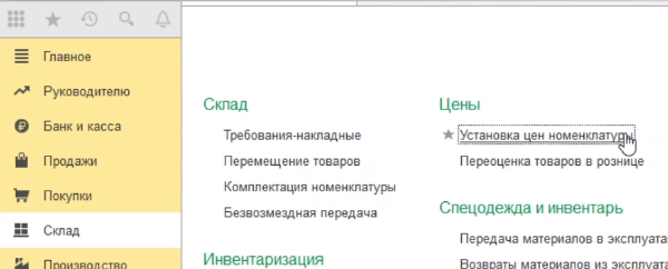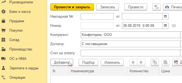Теперь мы хотим сделать так, чтобы в документах поступления автоматически проставлялась именно эта цена для этой номенклатуры. Делаем документ поступление. Нажимаем покупки, поступление (акты, накладные).