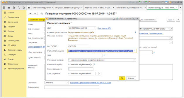 В Налоговом кодексе РФ установлено, что процедура оплаты может происходить в наличной или безналичной форме. При внесении средств через кассу или банк у бухгалтеров не возникает резонных вопросов относительно процесса внесения средств, так как подотчетное лицо предоставляет все необходимые оправдательные документы. Рассмотрим возможности программы 1С:Бухгалтерия в части отражения госпошлины, как провести ее оплату и вытекающие из этого проводки в 1С 8.3.
