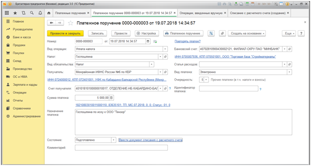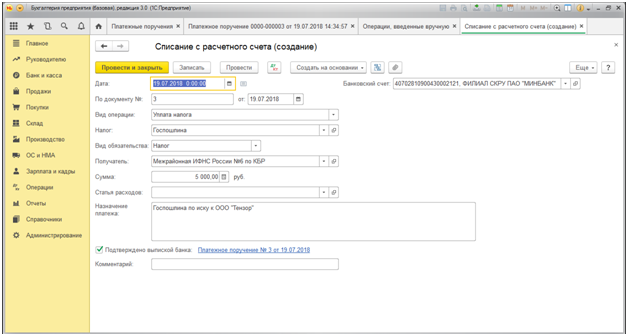 Как сделать проводки по начислению и уплате госпошлины в 1С 8.3