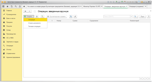 При запуске программы 1С:Бухгалтерия в новом окне пользователь кликает по команде «Создать», далее - «Операции».
