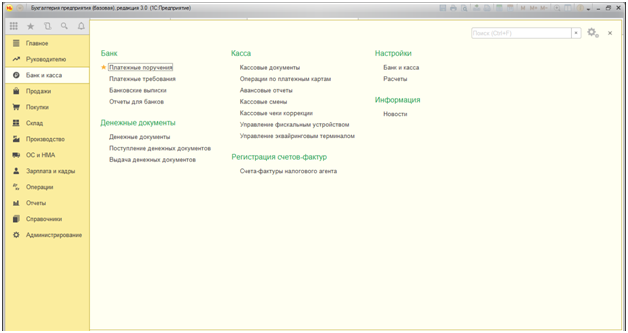 Пользователь переходит в меню «Банк и касса», а затем «Платежные поручения».