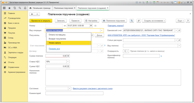 В новом окне платежного поручения необходимо выбрать вид операции «Уплата налога». Система автоматически сформирует платежное поручение с полями 104-110.