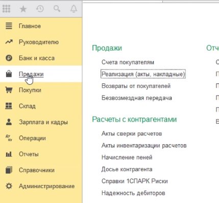 Для этого идем в раздел продажи, реализация (акты, накладные).