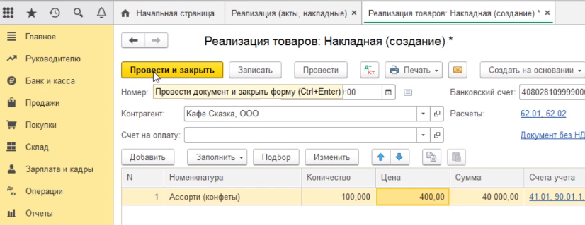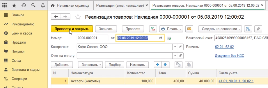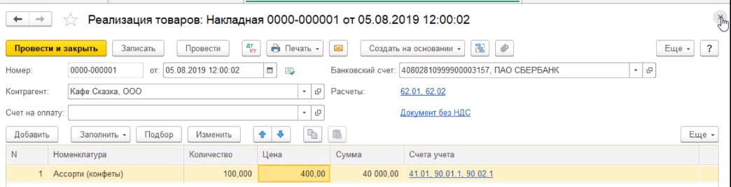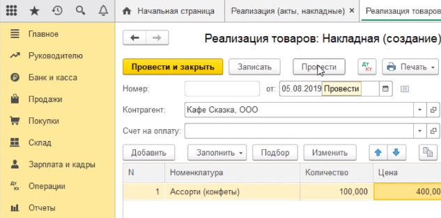 Тогда программа проведет документ и закроет экранную форму. Если же нам экранная форма нужна для дальнейших действий, то мы делаем проведение без закрытия. Нажимаем кнопку провести.