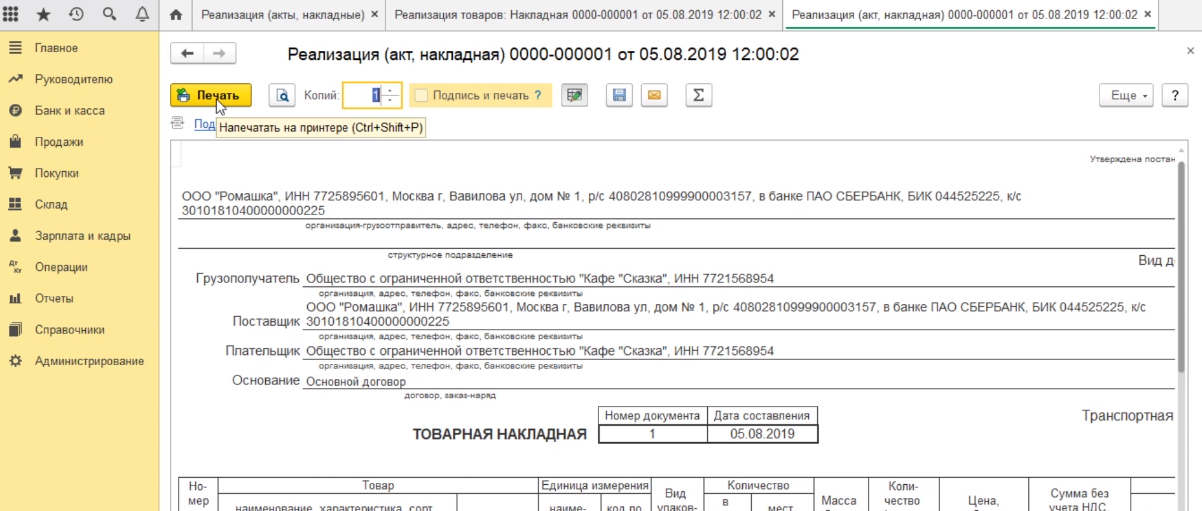 Далее переходим по кнопке печать в товарную накладную (Торг-12).