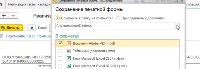 При нажатии на эту кнопочку открывается окно выбора формата и места сохранения. Здесь представлены самые ходовые форматы вордовский, экселевский, пдф формат. Мы выбрали пдф формат.