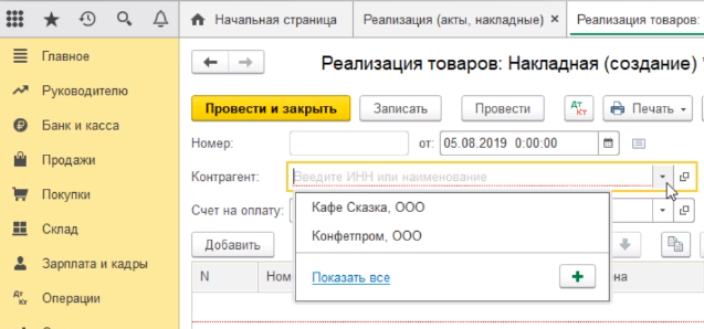 Далее выбираем контрагента, которому мы осуществляем реализацию. Нажимаем на кнопочку показать все.