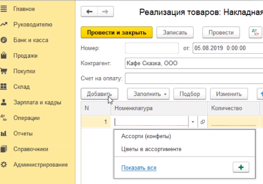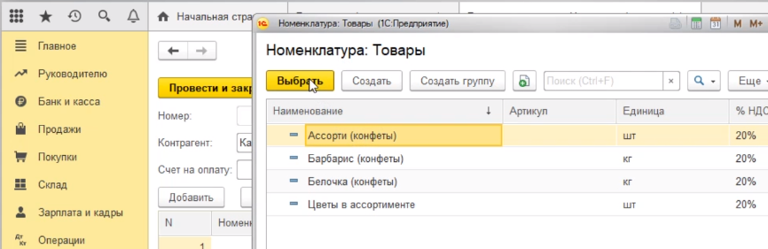 Попадаем в справочник номенклатуры. Далее выбираем номенклатуру. В нашем случае конфеты Ассорти. Нажимаем кнопку выбрать.