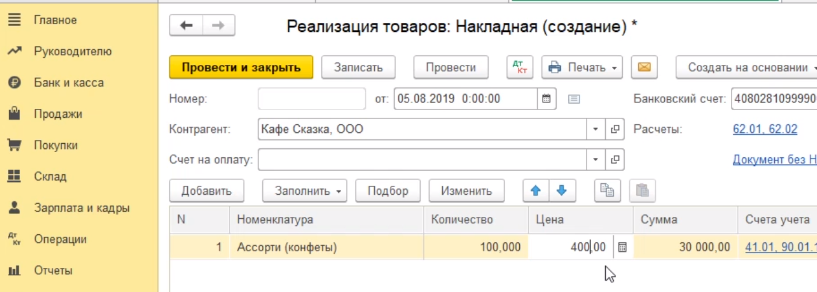 Количество, например, сто штук. Цена установилась в программе та, которая была указана нами в последнем документе реализации. Программа предполагает, что мы по той же цене будем и дальше этот товар продавать. Если есть необходимость цену поменять, то это можно сделать сразу здесь в документе. В нашем примере поменяем на четыреста рублей. Сумму программа пересчитала автоматически.