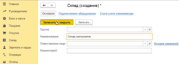 Это то лицо, фамилия которого будет подставляться в документы отгрузки со склада. Допустим наименование склад "материалов". Далее нажимаем записать и закрыть.