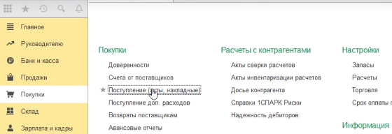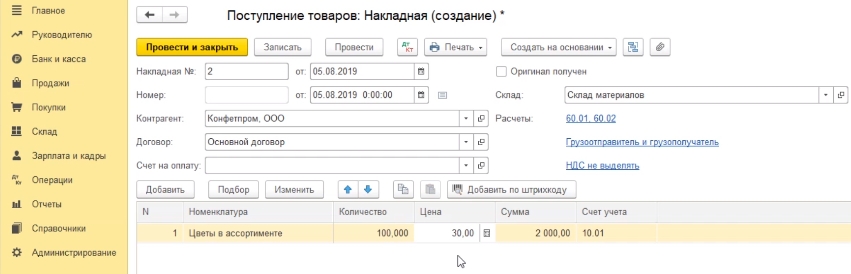 Выбираем тот склад, на который мы хотим поступающие товары или материалы соответственно оприходовать.