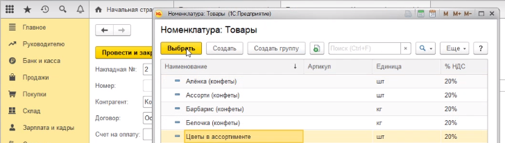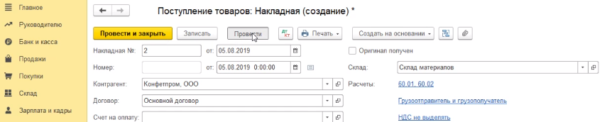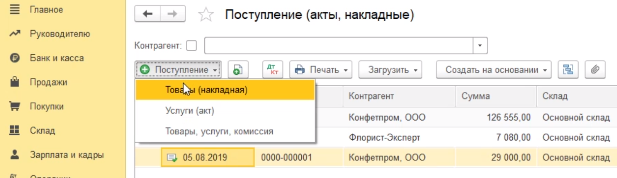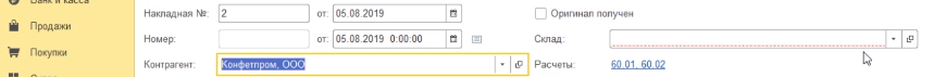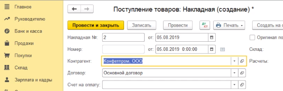 Указываем номер акта и дату поступления. Контрагента нашего поставщика. Выберем, например, "Конфетпром". Автоматически подтягивается основной договор с "Конфетпром".