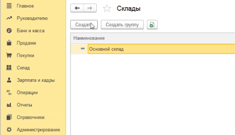По умолчанию здесь один склад уже создан программой. Мы можем сюда добавить необходимые для работы склады. Нажимаем кнопочку создать.