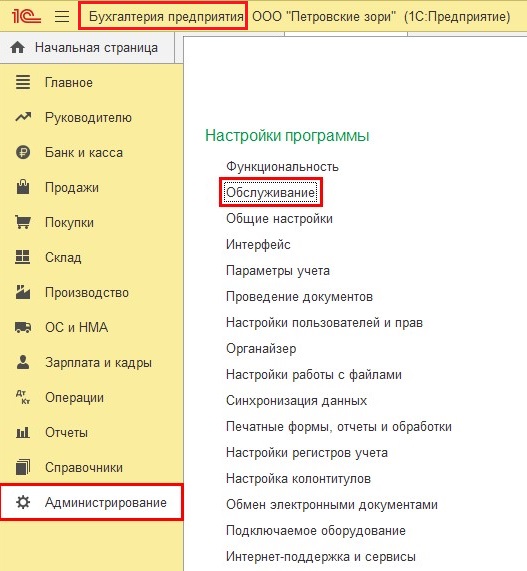- Открыв раздел «Администрирование», выбрать там пункт «Обслуживание». Здесь нужно будет выбрать процедуру «Удаление помеченных объектов».