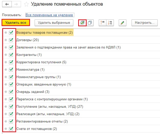 - После нажатия на кнопку «Удаление помеченных объектов» появится окно, в котором объекты будут удалятся из информационной базы. Все они будут помечены «галочками».