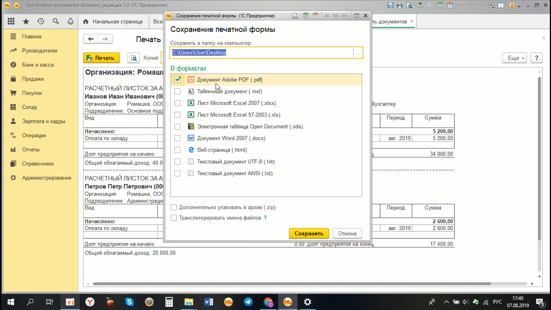 Мы, соответственно, можем послать их на печать с помощью кнопки «Печать». Также можем сохранить в электронном виде с помощью кнопки «Сохранить на диск», указав необходимый требуемый формат для сохранения, это либо документ Word или таблица Excel, либо PDF формат, в нашем случае PDF. И место, куда мы будем это сохранять, в нашем случае рабочий стол. Сохраняем расчетные листки.