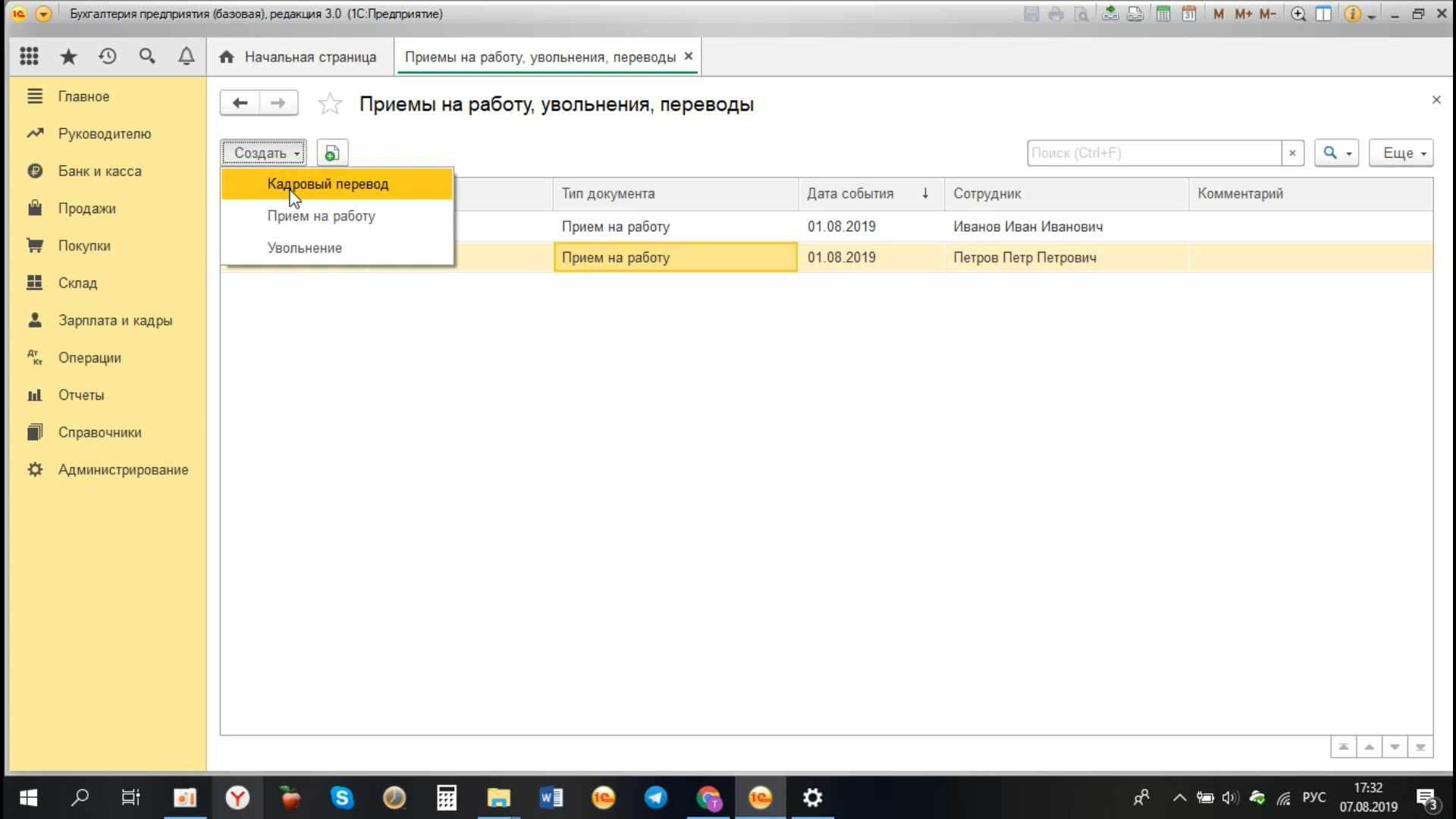 С помощью кнопки «Создать», выбираем «Кадровый перевод».