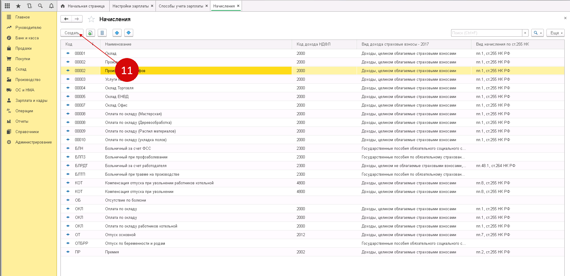 Тут можно увидеть все виды начислений заработной платы, которые были созданы ранее. Для нового нажимаем кнопку «Создать» (11) и видим окно для новой настройки.