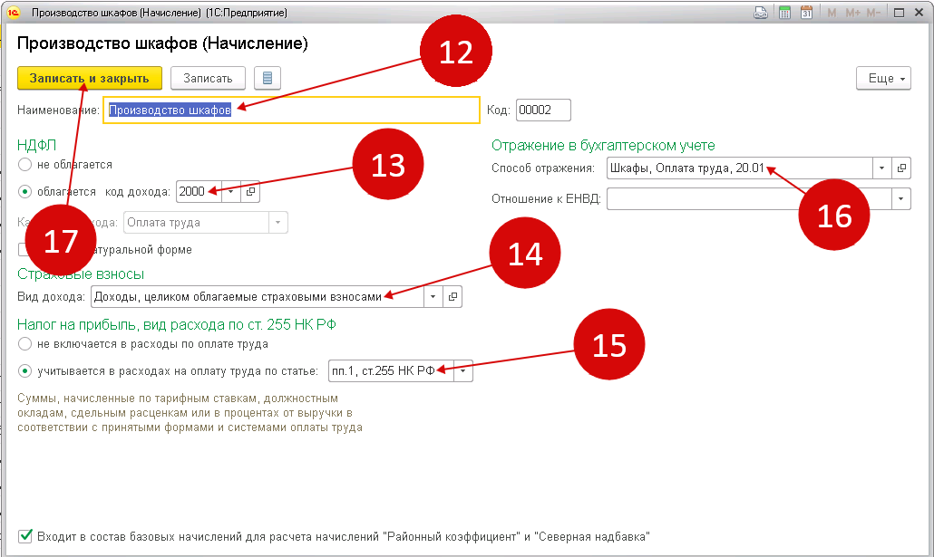 В «Способе отражения» (16) указываем новый способ отражения зарплаты, для сохранения изменений нажимаем «Записать и закрыть» (17). Все номенклатурные группы требуют наличия своего вида начисления для использования его в ведении учета зарплаты производственных рабочих. Если выпускалась продукция таких номенклатурных групп как «Шкафы» и «Столы», то и начисление зарплаты также формируем для этих номенклатурных групп.  Если начислить зарплату по другой номенклатурной группе, то счет 20 не сможет закрыться.