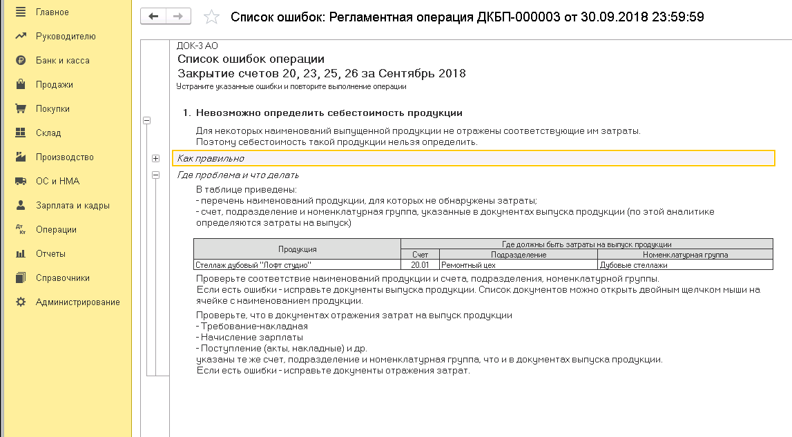 Корректный учет производственных документов невозможен, если не заполнить поля «Номенклатурная группа» и «Подразделение затрат». Выпуская один вид продукции в рамках одного подразделения, эти показатели в таких документах как «Требование-накладная» и «Отчет производства за смену» должны быть идентичными. Если в требовании-накладной при передаче материалов на производство указан «Мебельный цех» и номенклатурная группа «Шкафы», то выпуская продукцию из этих материалов также нужно отметить подразделение «Мебельный цех» и «Шкафы» в номенклатурной группе. Иначе в закрытии месяца произойдет ошибка и появится сообщение: