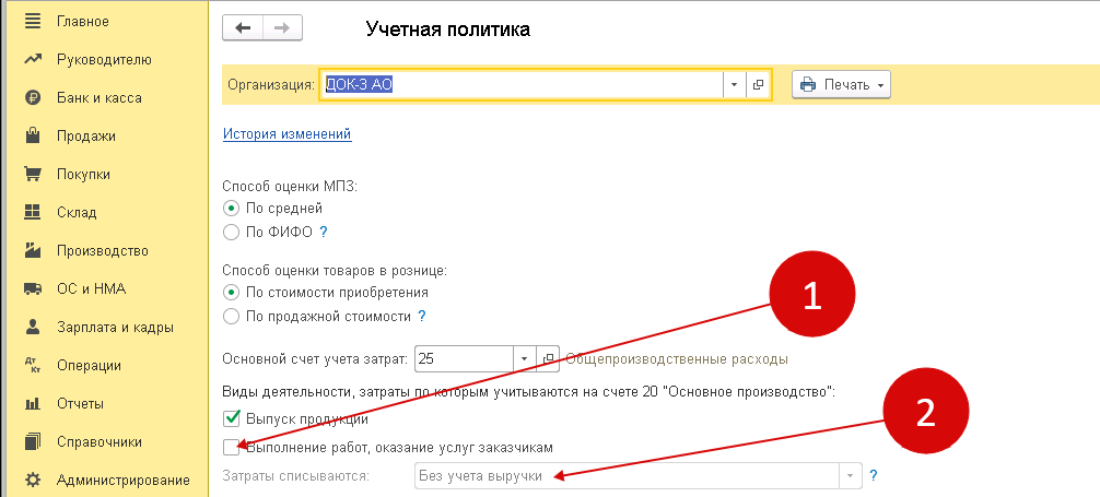 Проблема с 20 счетом может возникнуть из-за неверной ее настройки. Настроить учетную политику для производства нужно в разделе «Главное» (1) выбрав ссылку «Учетная политика» (2).