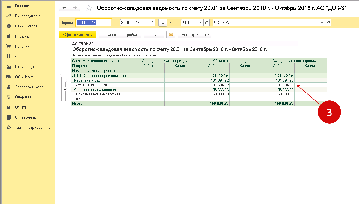 Таким образом, если в программе не закрывается 20 счет, то вполне возможно, что и выпуска в этом периоде не было. Это значит, что закрытие счета 20 будет в следующих периодах, когда будет выпуск продукции. Возможна ситуация, когда материалы на производство переданы, а выпуска продукции не было. В результате возникает незавершенное производство, которое отражается в оборотно-сальдовой ведомости по дебету 20 счета на конец месяца (3).