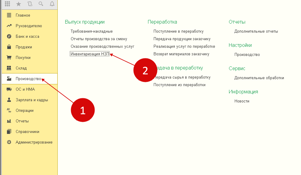 Стоимость незавершенного производства отражается по дебету счета 20 как остаток в конце периода. В предыдущем пункте был рассмотрен случай, когда в отчетном периоде вообще не происходил выпуск продукции. В остальных случаях для отражения остатка незавершенного производства в 1С 8.3 используется такой документ как «Инвентаризация незавершенного производства». Для его создания нужно найти раздел «Производство» (1) и выбрать «Инвентаризация НПЗ» (2).