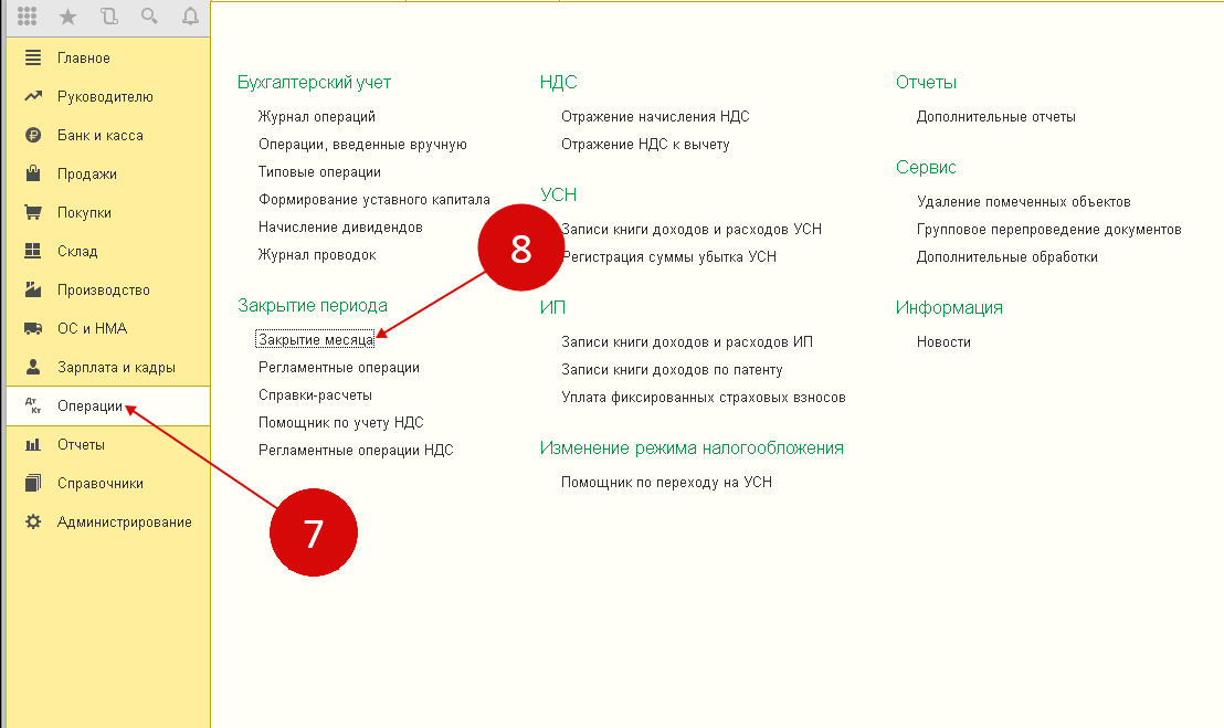 Для закрытия месяца, в разделе «Операции» (7), выбираем ссылку «Закрытие месяца» (8).