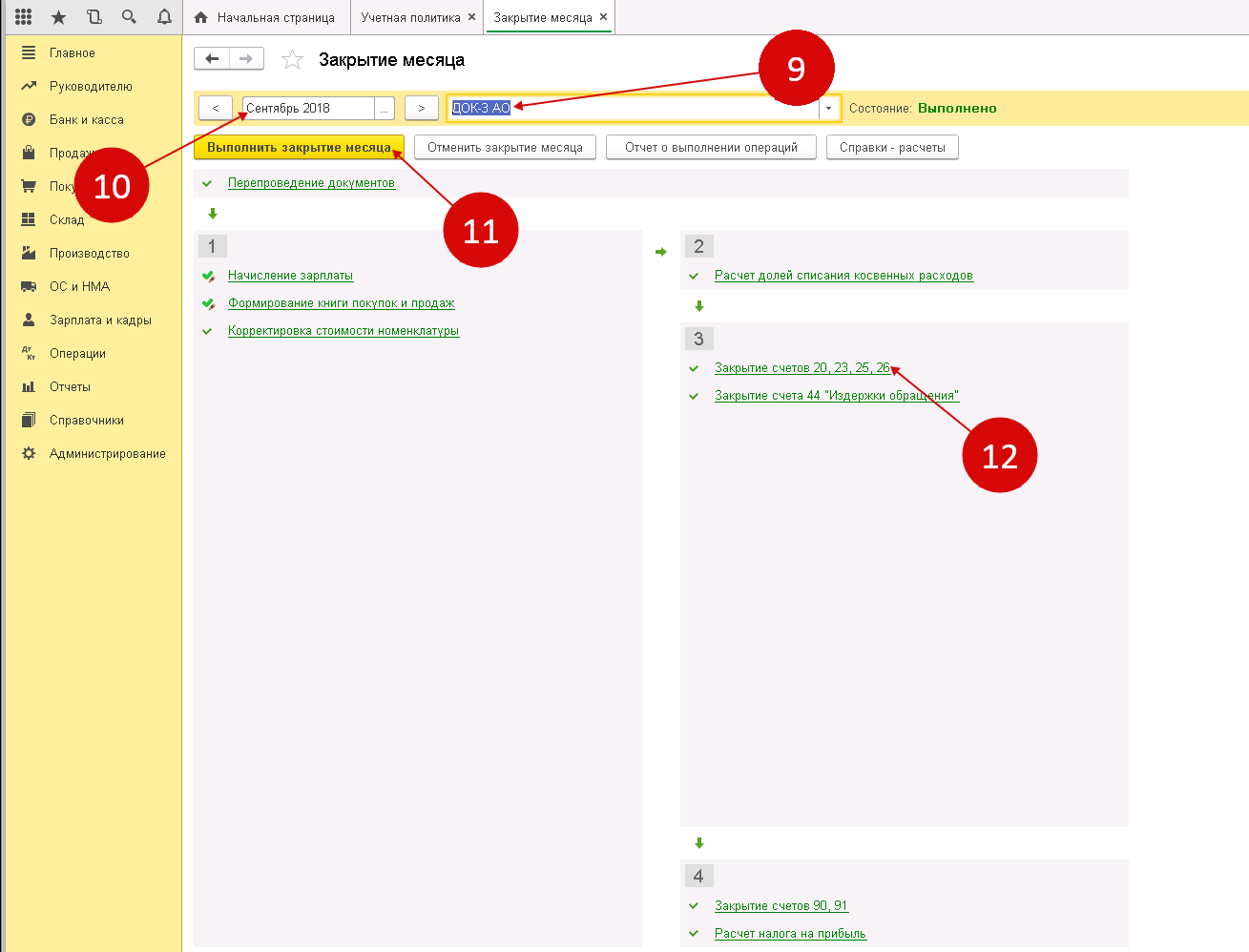 Далее выбираем свою организацию (9), указываем период (10) и нажимаем «Выполнить закрытие месяца» (11). При правильном закрытии операция «Закрытие счетов 20, 23, 25, 26» (12) будет отмечено зеленым с доступными для просмотра проводками.