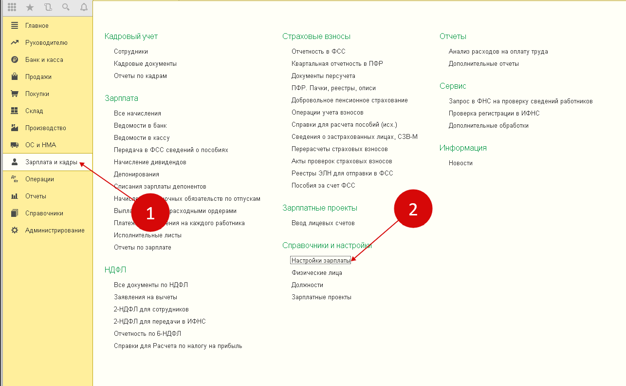 Закрытие счета 20 напрямую зависит от правильности определения номенклатурной группы при начислении зарплаты производственным работникам. Для этого в разделе «Зарплата и кадры» (1) выбираем «Настройки зарплаты» (2).