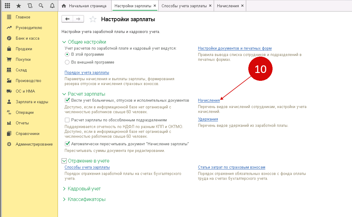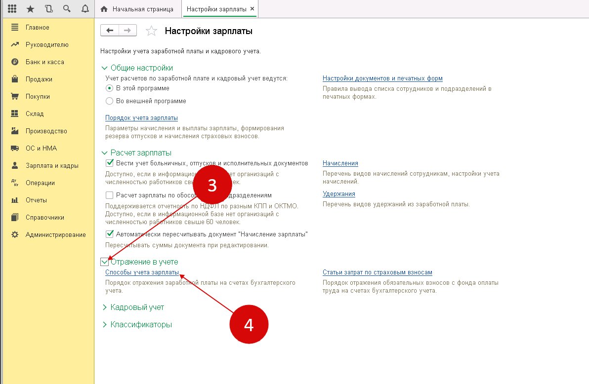 В настройках находим раздел «Отражение в учете» (3) и выбираем «Способы учета зарплаты» (4).