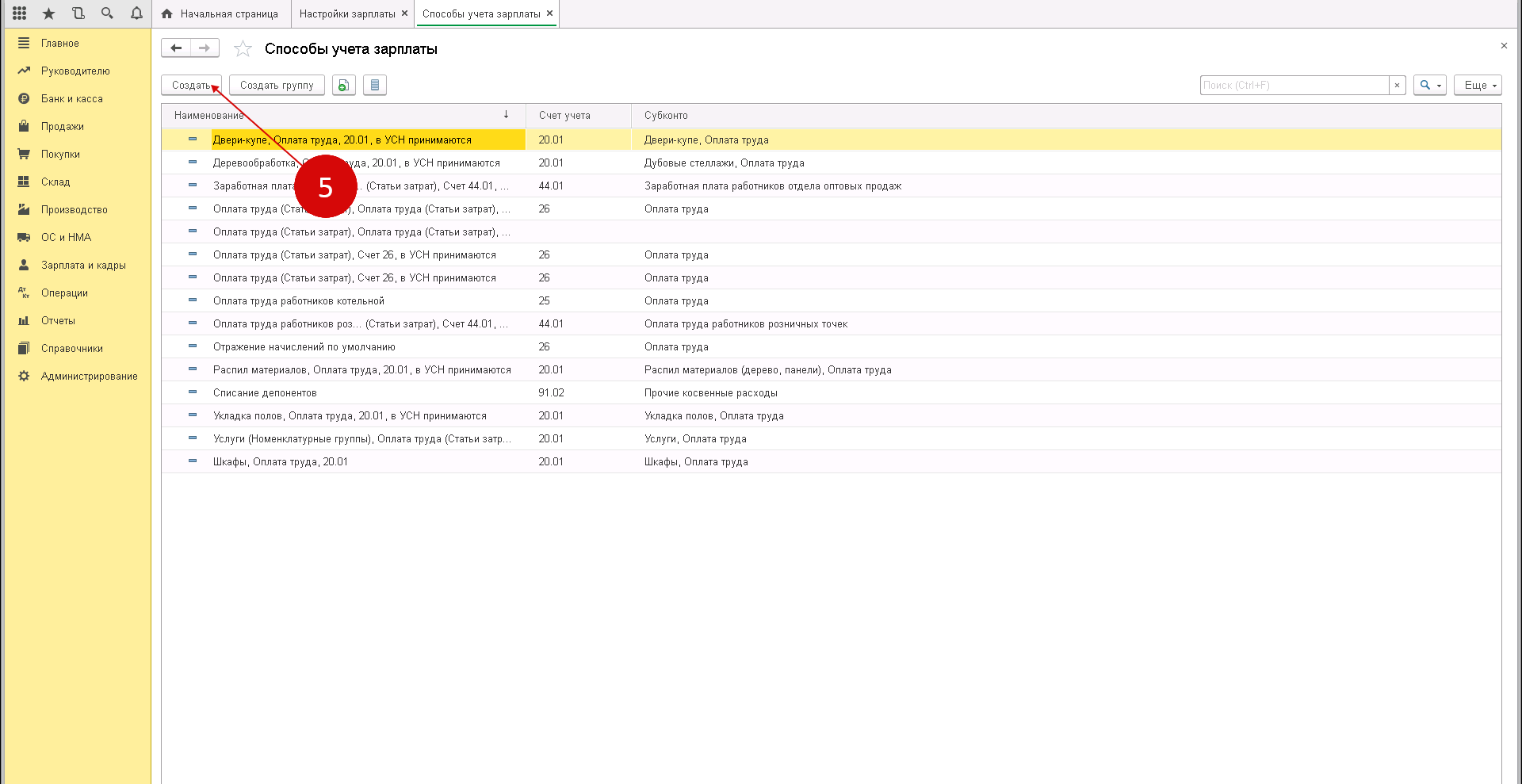 В открывшемся окошке «Способы учета зарплаты» видно список всех уже существующих на предприятии способов начислений заработной платы. Для создания нового способа, например, для зарплат тех работников, которые заняты на производстве шкафов, жмем «Создать» (5).
