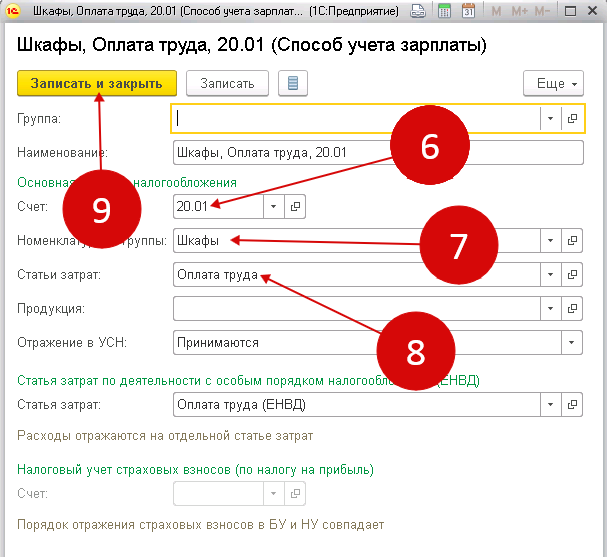 Находим счет «20.01» (6), далее в разделе «Номенклатурные группы» (7) выбираем нужное значение, к примеру, «Шкафы». Указываем нужную статью в статьях затрат (8). Чтобы не потерять настройки наживаем «Записать и закрыть» (9). Далее в справочнике «Начисления» вносим для этого способа новые параметры.