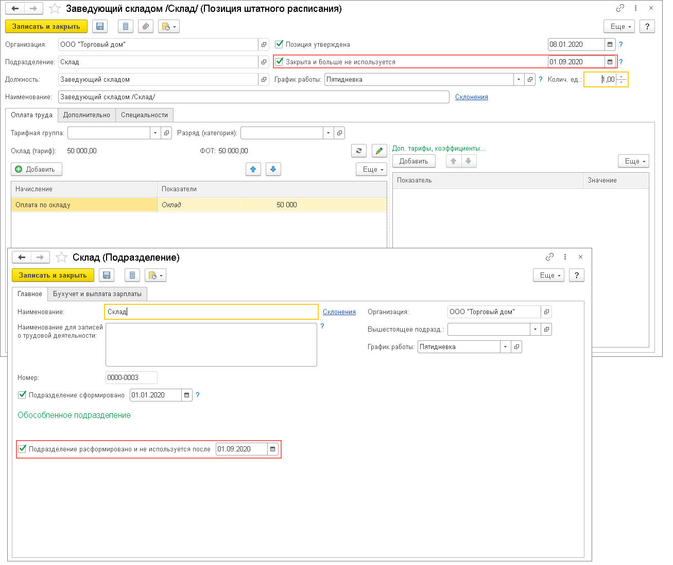 В данном случае дата расформирования подразделения — это дата закрытия позиции в штатном расписании. И тогда в карточке подразделения в автоматическом режиме будет установлена галочка «Подразделение расформировано и не используется после» с указанием именно этой даты расформирования.