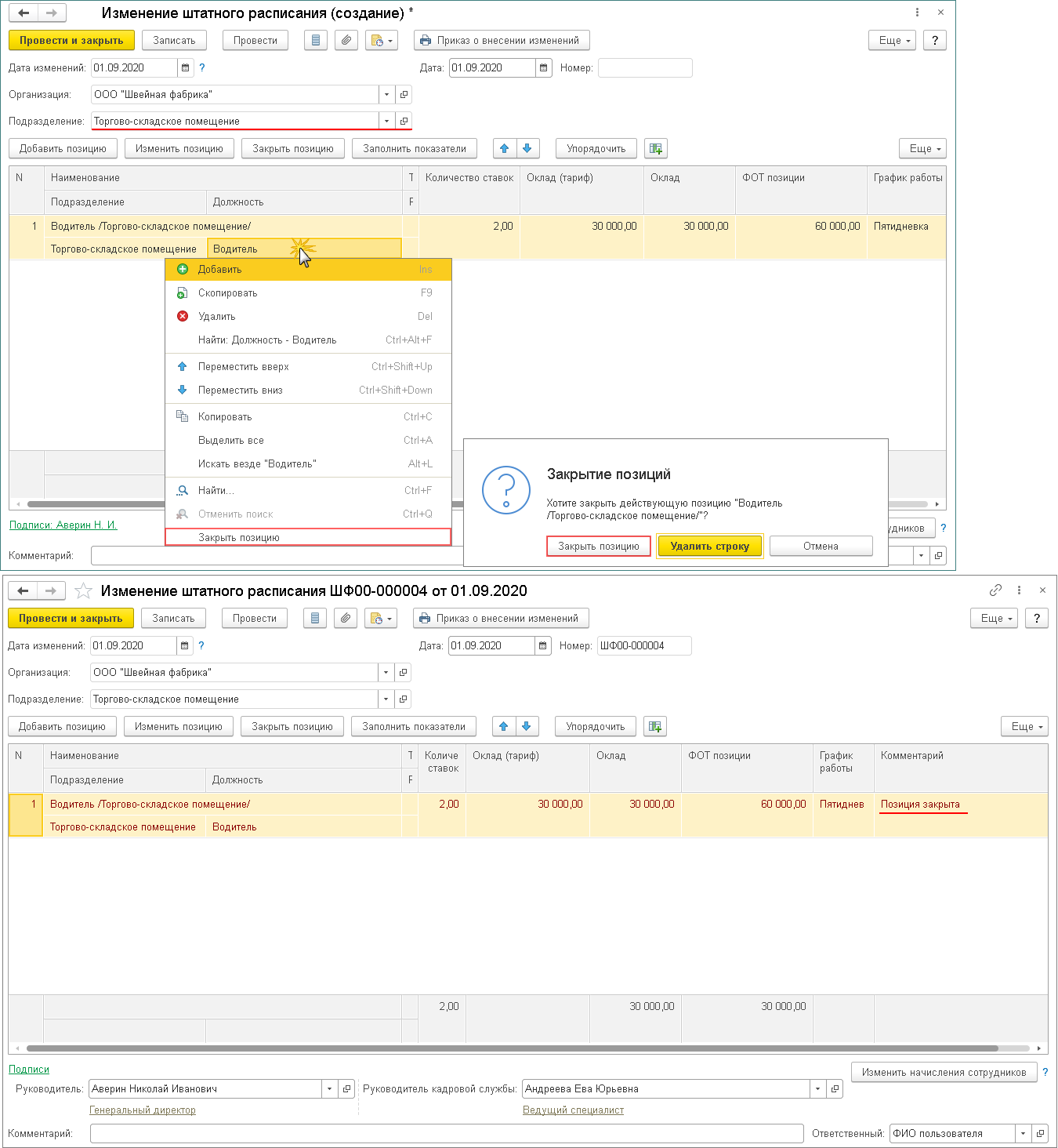 Но сначала нужно закрыть все позиции штатного расписания в неиспользуемом подразделении. Для этого надо поставить галочку «Закрыта и больше не используется» и указать дату, с которой позиция выведена из штатного расписания.