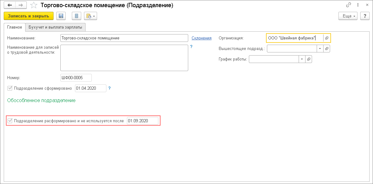 - в графе «Подразделение» выбрать то, которое расформировано;