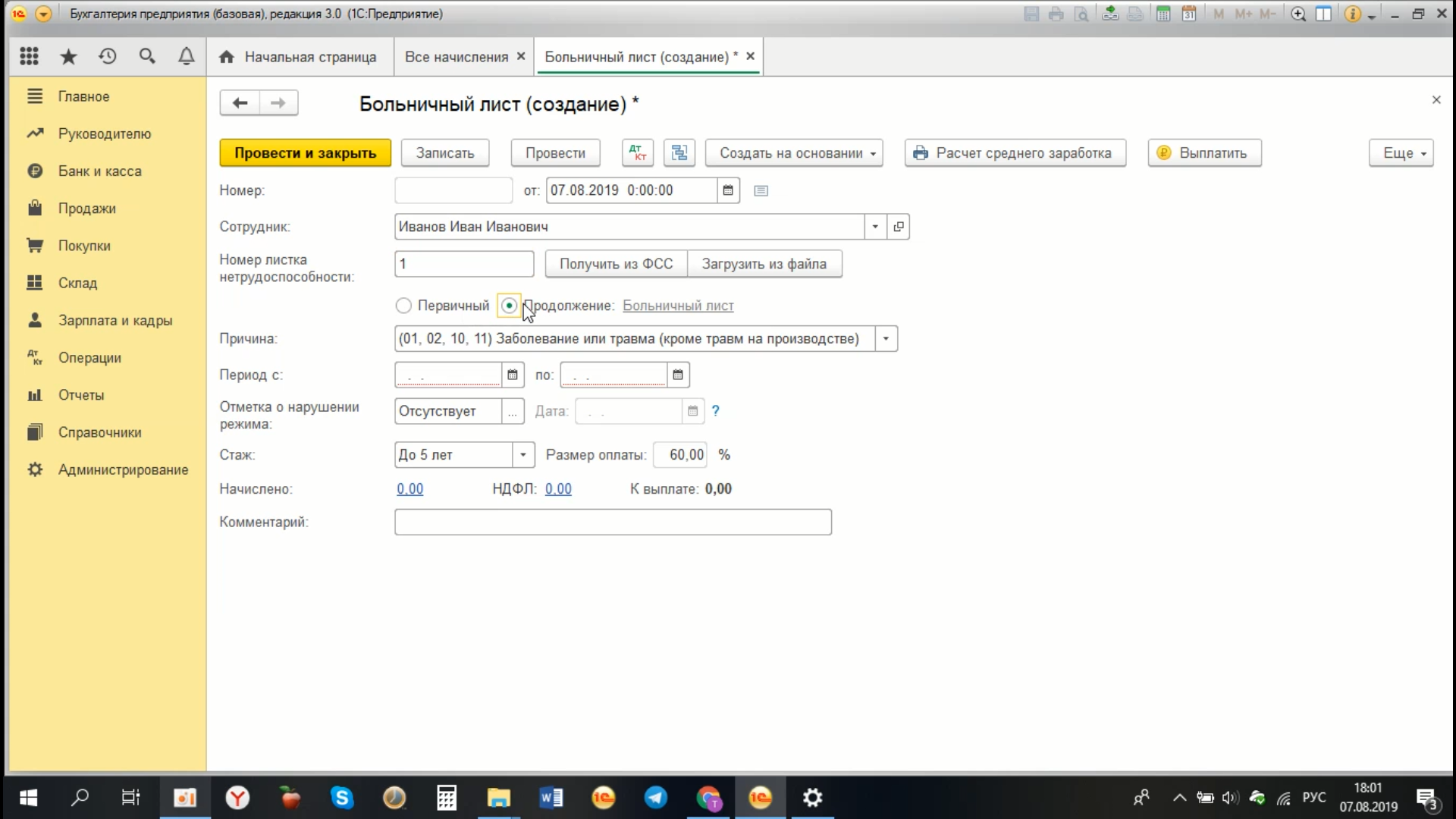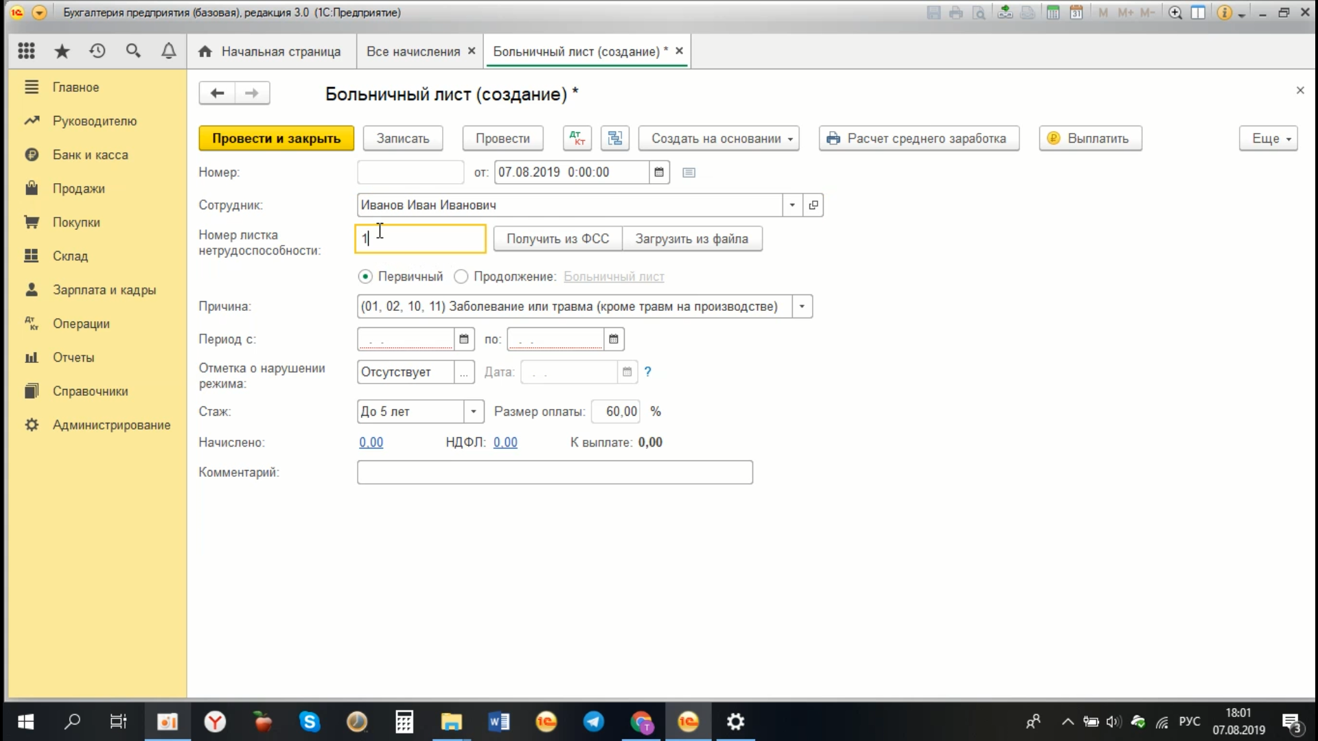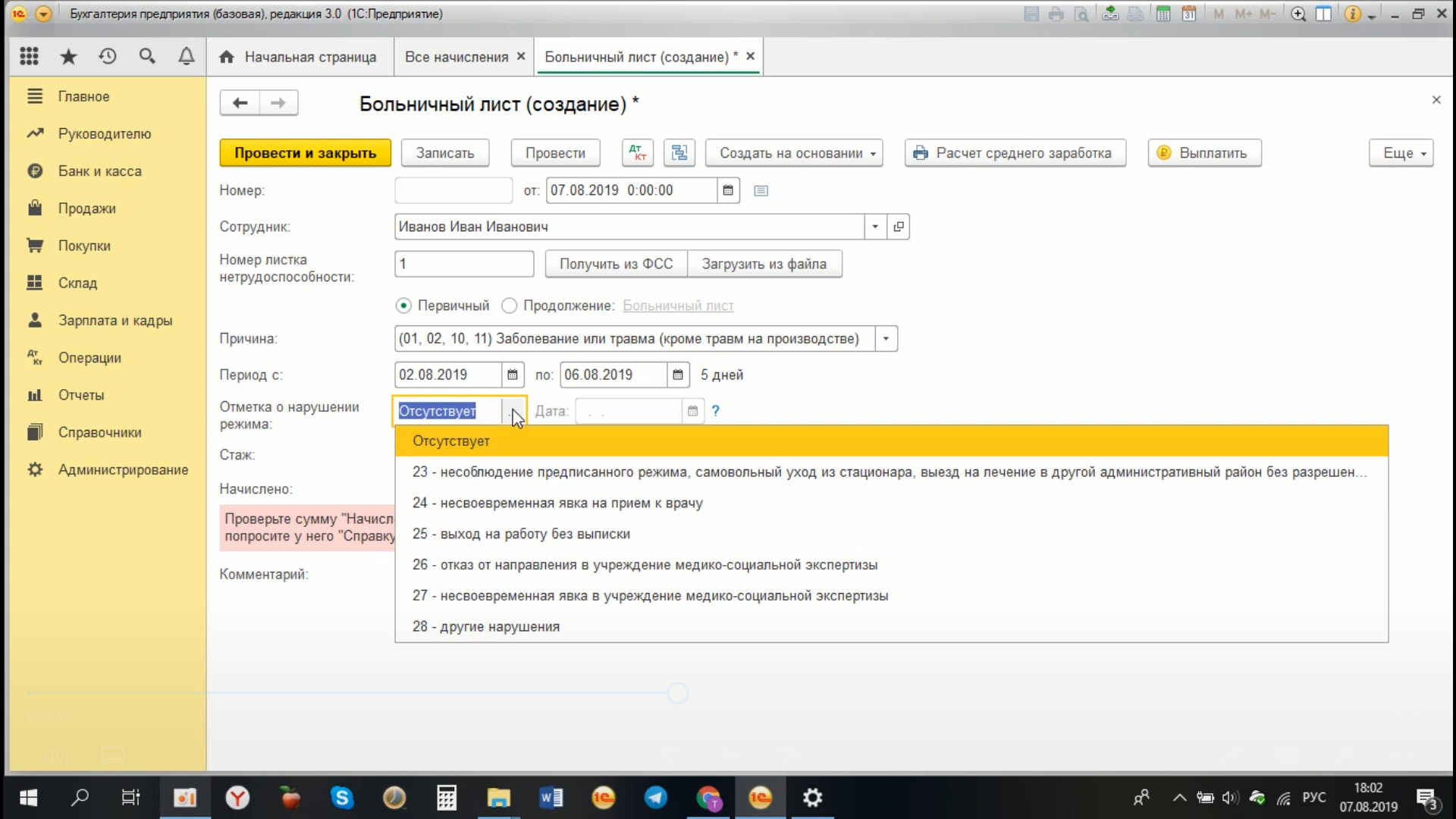 Как в программе 1С Бухгалтерия 8.3 оформить невыход или больничный