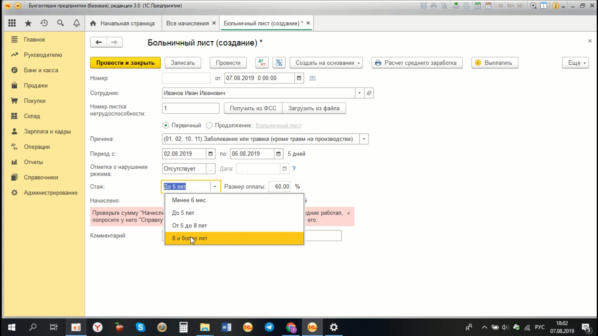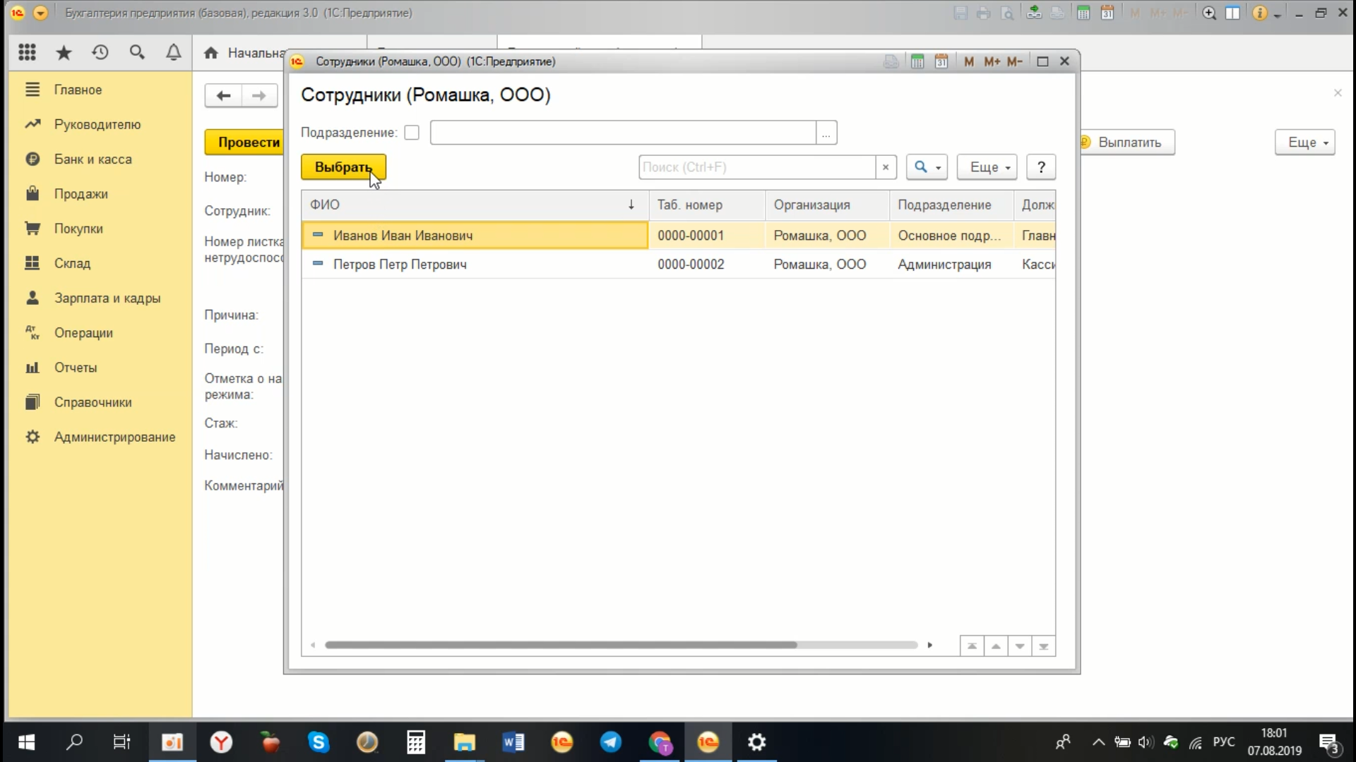 В документе указываем, соответственно, сотрудника, который предъявил нам больничный лист, в нашем случае - это будет Иванов Иван Иванович, выбираем его.