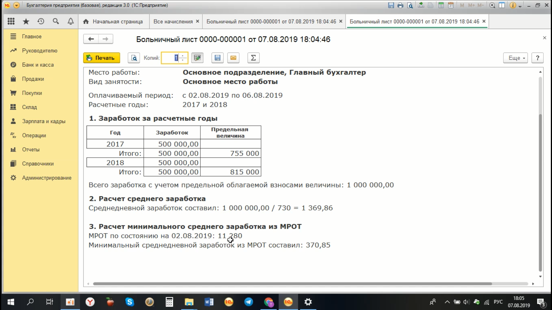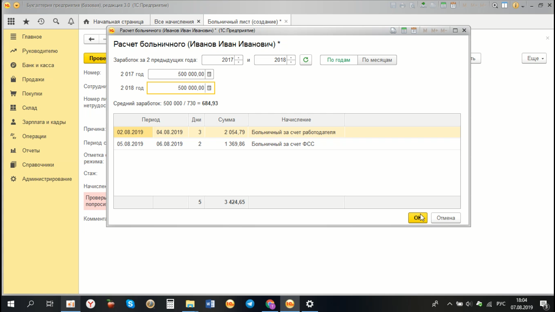 У нас ситуация следующая: программа нам подсказывает «Проверьте сумму «Начислено» есть периоды с нулевым заработком и. т.д». Речь идет о том, что она нам начислила за эти 5 дней болезни всего 1854.25 рубля, потому что нет полной информации о заработке за предыдущие 2 года. Как можно уточнить. Для этого мы по ссылке «Сумма начислено», открываем окошко, где мы видим, что за 2017 и 2018 год в программе нет данных о заработной плате нашего сотрудника. Учет мы начали вести недавно в программе, поэтому данную информацию в программе взять неоткуда. Мы можем исправить данную ситуацию путем ручной корректировки сумм заработка за два предыдущих года. То есть мы можем просто указать в программе реальный заработок, который получал сотрудник в 2017 и в 2018 году. Допустим, пускай это было по 500 тысяч рублей за 2017 год и за 2018 год, нажимаем «ОК». Теперь программа пересчитала средний заработок до величины с учетом тех заработков, которые были у сотрудника в 2017 и 2018 году, нажимаем «ОК».