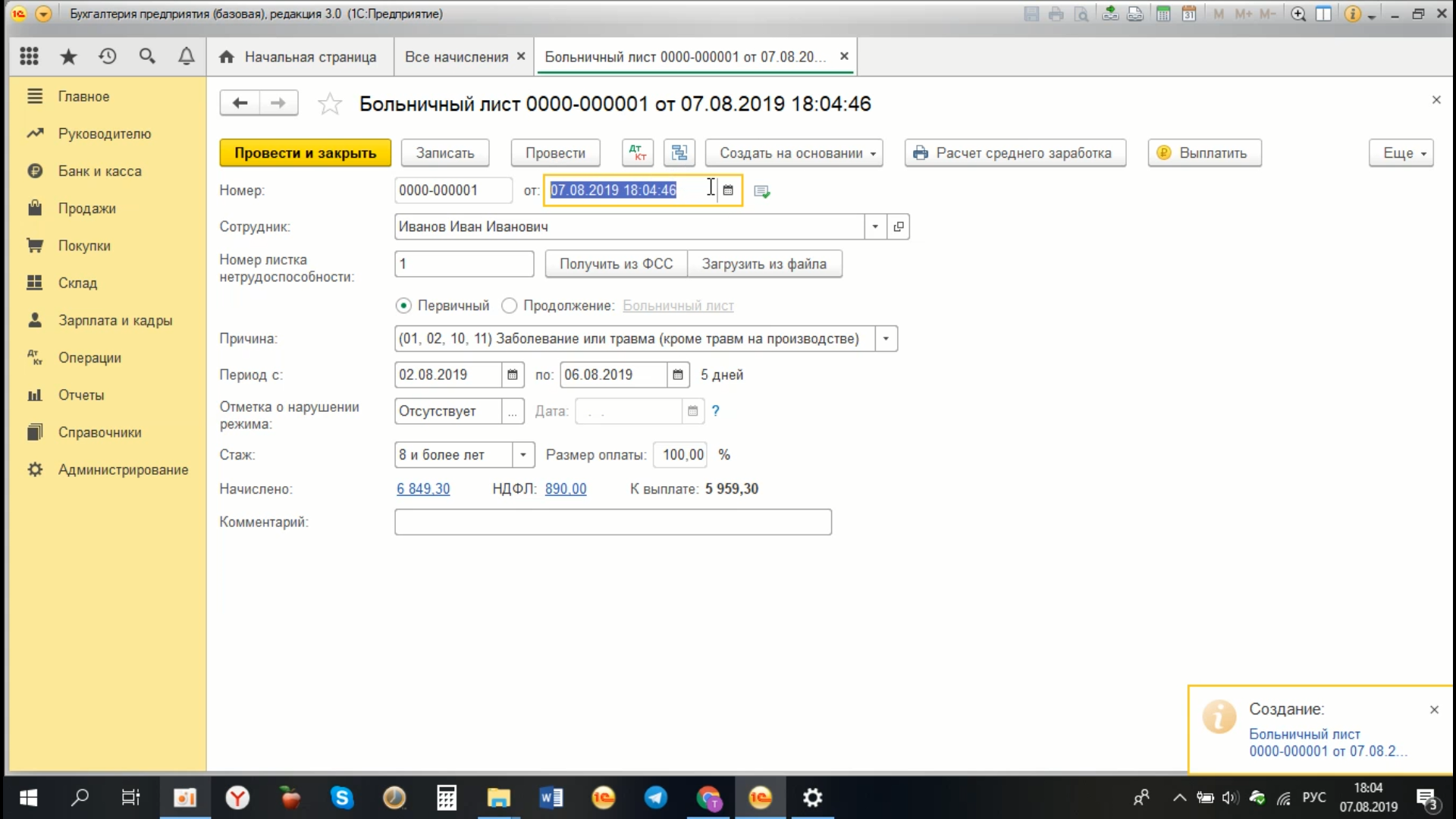 Больничный лист мы с вами сформировали, можно закрывать документ.