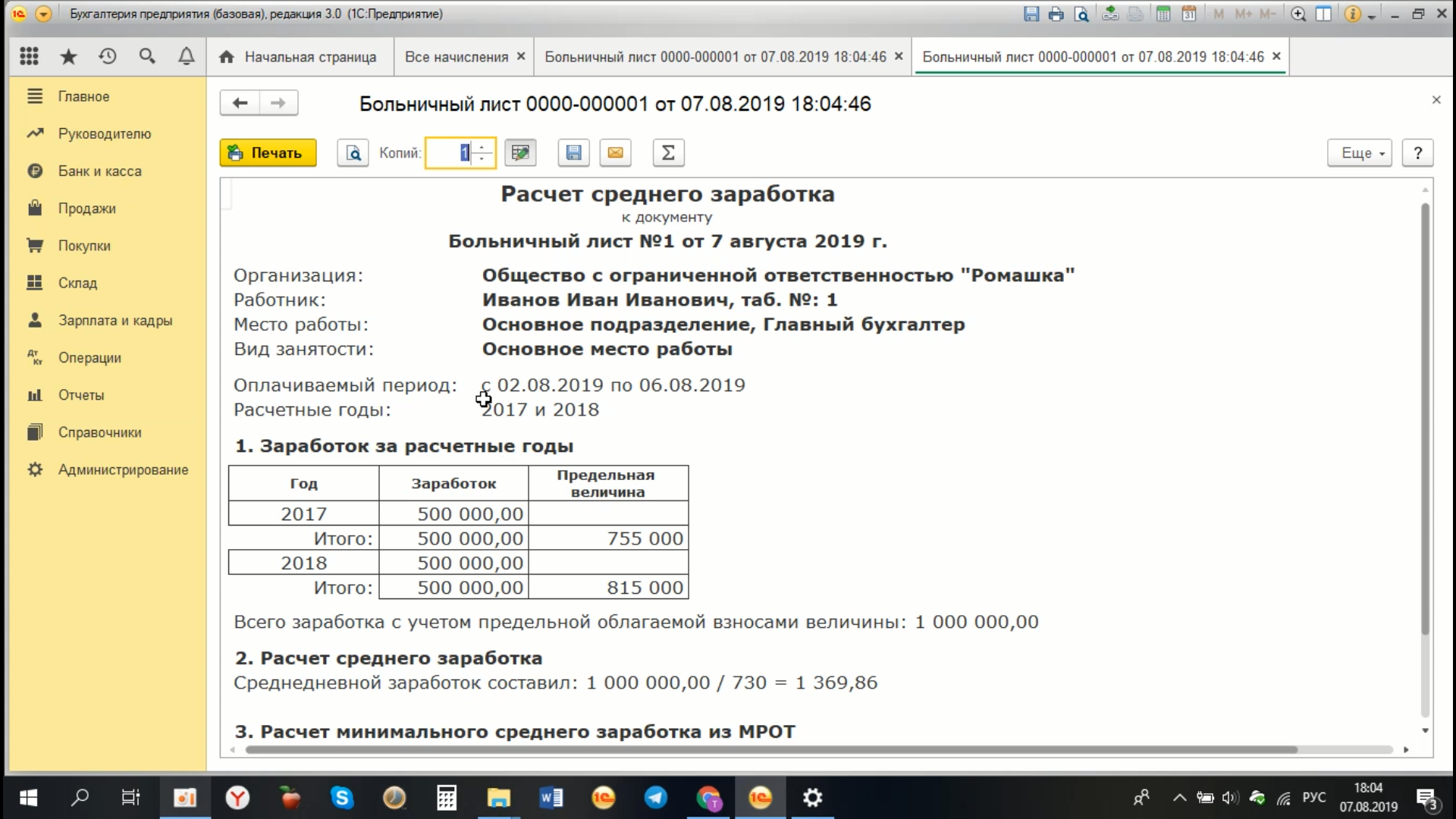 Для проверки расчета среднего заработка можем вывести справку с помощью кнопки «Расчет среднего заработка», где программа нам покажет, из чего исходила.