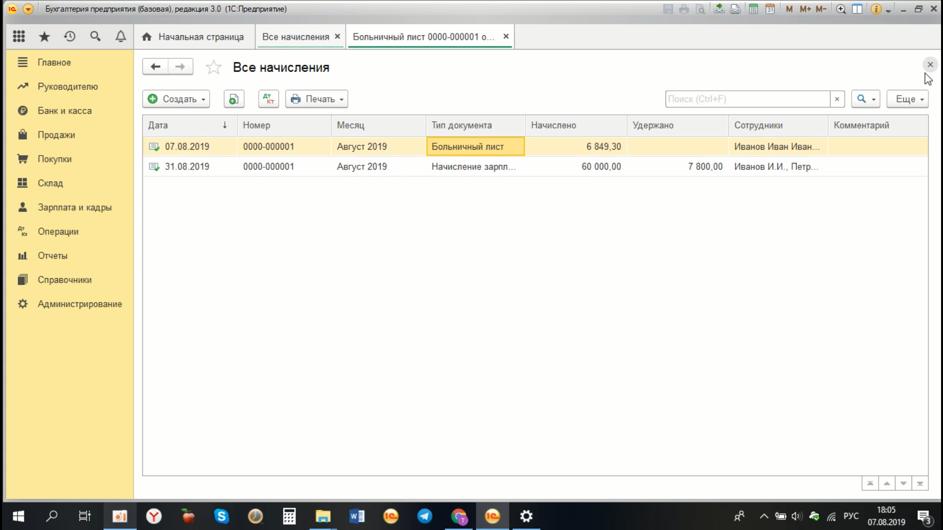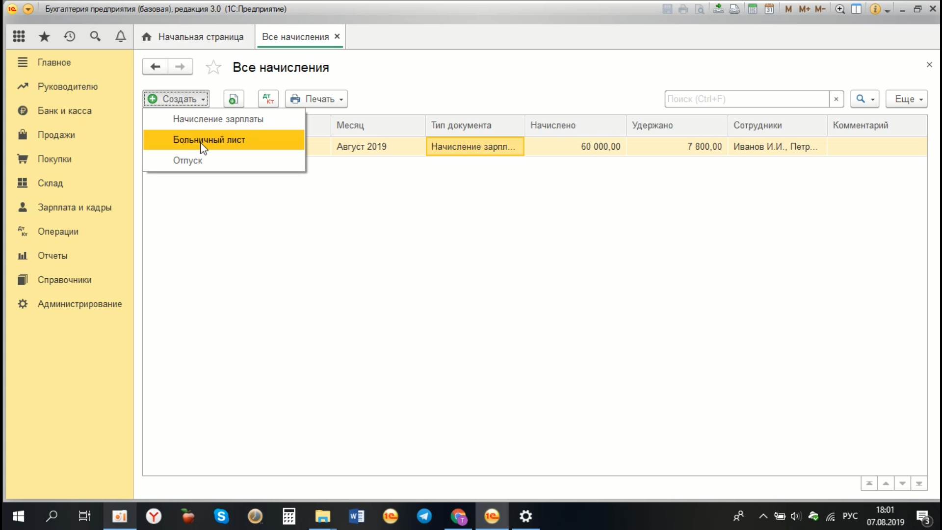 Автоматически программа умеет учитывать больничные листы. Посмотрим, как в программе можно сформировать больничный лист. Для этого выбираем «Зарплата и кадры», «Все начисления»,