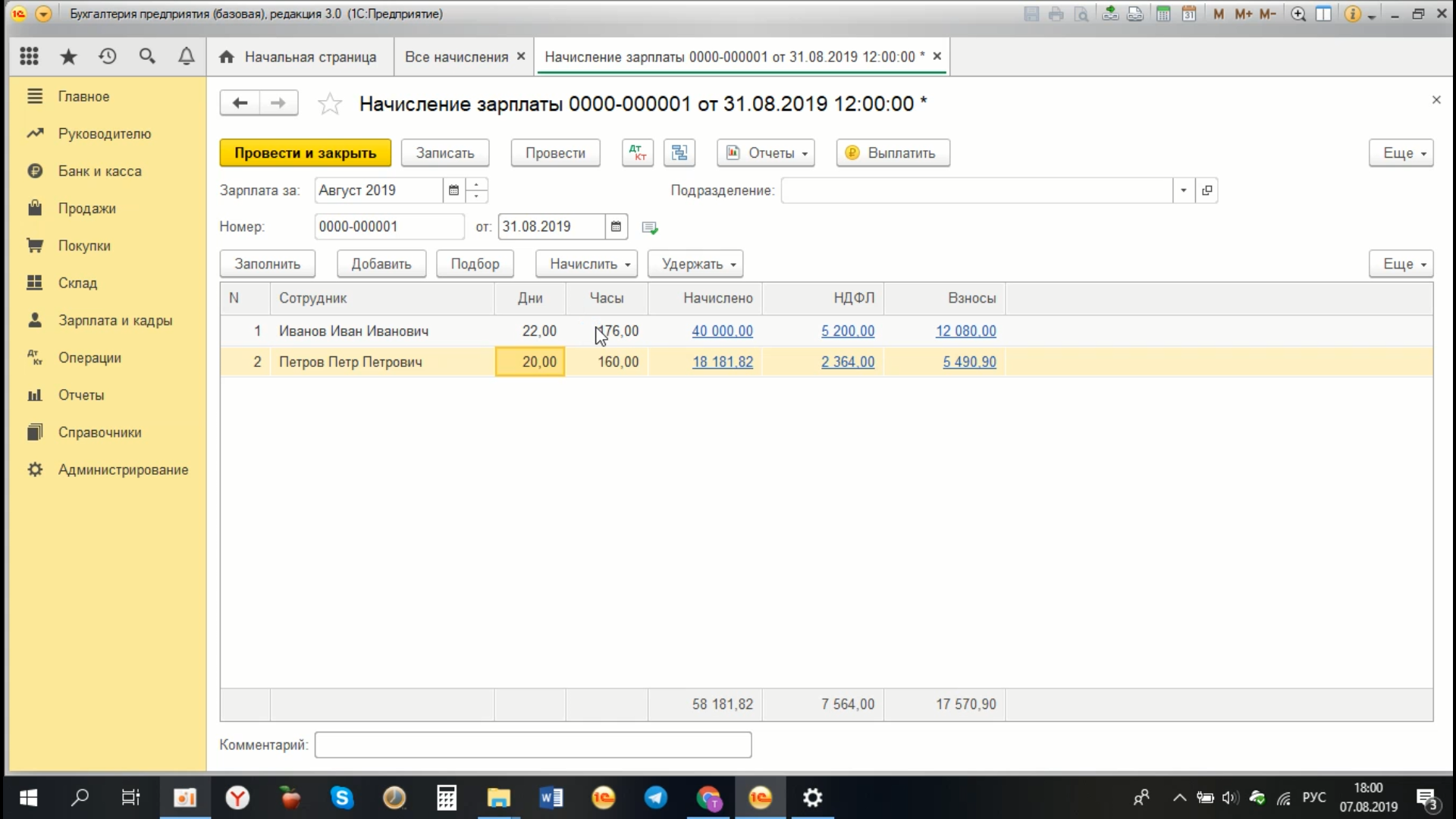 Если это был неполный рабочий месяц, скажем, если у нас Петров работал не 22 дня, а всего лишь 20 дней, то есть 2 дня он отсутствовал, мы меняем количество дней на фактически отработанные. Программа сама пересчитала размер начисления в соответствии с количеством отработанных дней и сделала соответствующие перерасчеты по всем налогам: НДФЛ, взносы и так далее. Невыходы нужно учитывать в ручном режиме.