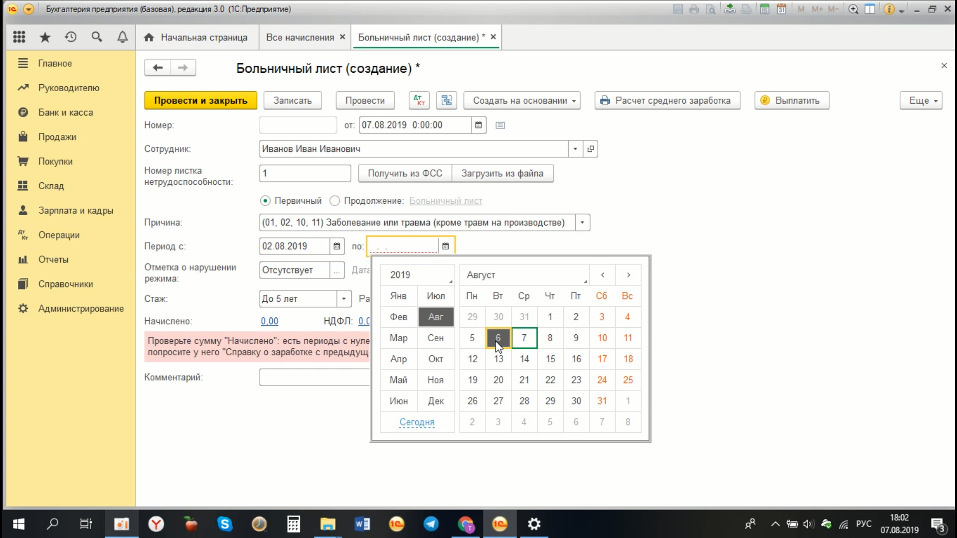 Период, когда у нас сотрудник болел и предъявил нам соответствующий лист. Например, в нашем случае он болел у нас со 2 августа по 6 августа.